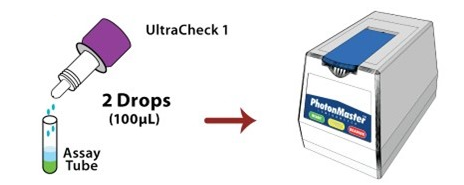 Hold the UltraCheck 1 bottle vertical and add 2 drops (100µL) to the test tube containing Luminase.